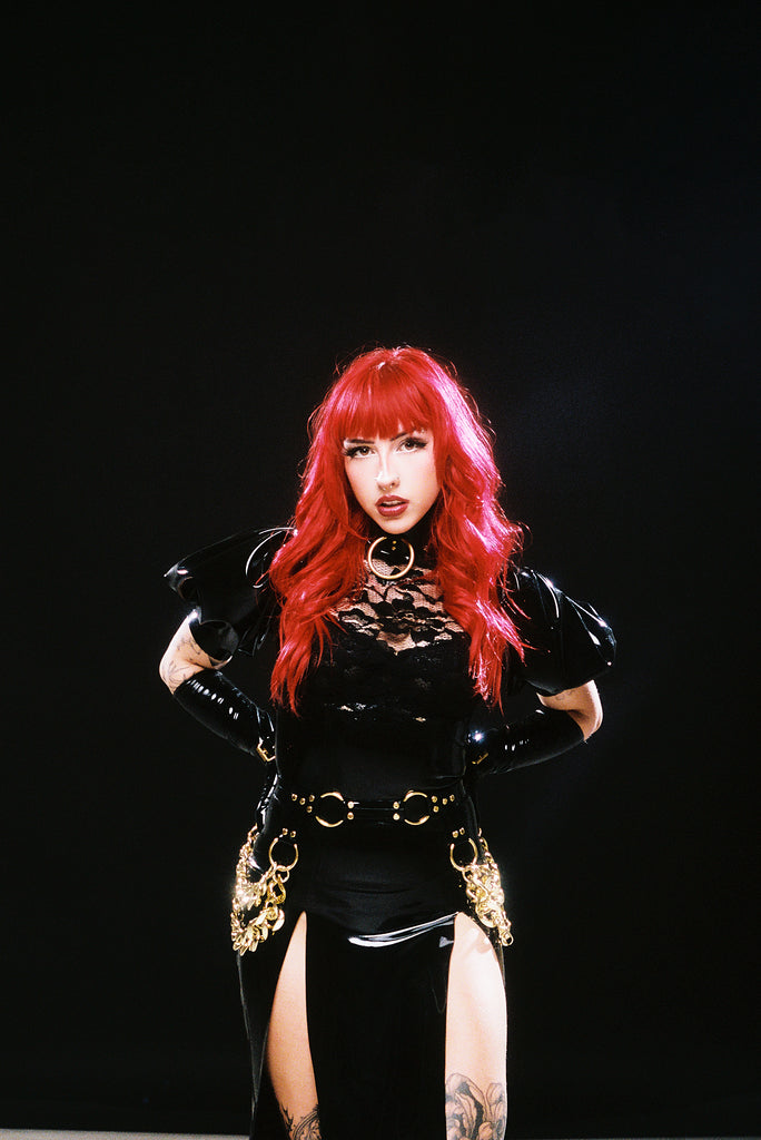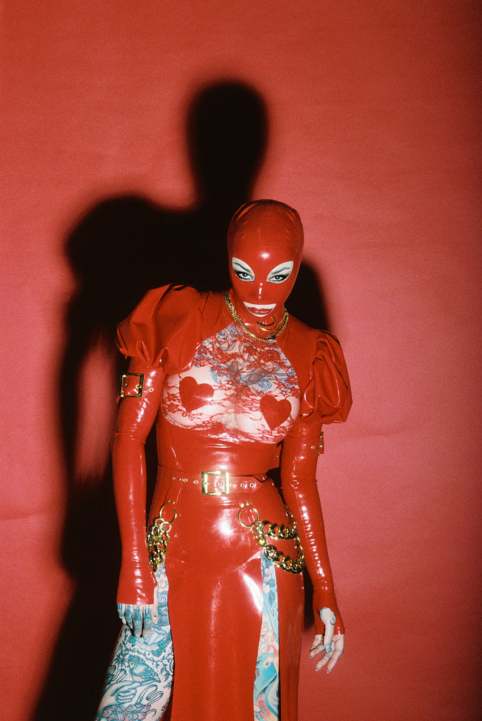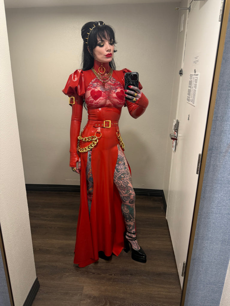 Including fingerless opera gloves, point O ring collar, heart pasties, double chain belt, hood and arm buckles